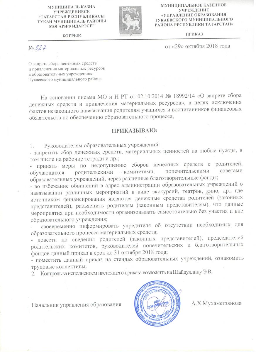 Приказ о недопущении незаконных сборов в МБДОУ д/с "Ромашка"