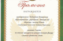 По итогам конкурса на лучшую снежную фигуру "Зимняя фантазия - 2016" наш коллектив занял 2 место. Списибо всему нашему коллективу и нашим родителям!