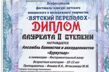 Поздравляем наших Лауреатов Всероссийского фестиваля-конкурса детского юношеского и молодежного творчества "Вятский переполох" - ансамбль баянистов и аккордеонистов "Буркутлар" п. Круглое Поле, руководители Фокина Вера Николаевна и Игтисамова Мавлуда Маратовна;Геворгян Гоару, руководитель Игтисамова М.М. и Дипломанотов - Мироненкову Аниту,Мирхотжаеву Мадину, Хаертдинову Зарину, руководитель Игтисамова М.М.!!! 28.02.2018