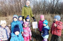 Балалар "Алма бакчасы"нда көзге табигатьне күзәттеләр. Бөек Ватан сугышында катнашкан авылдашларга исемләп утыртылган алмагачларны күрделәр.