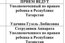 Прием граждан в Аппарате Уполномоченного по правам ребенка в Республике ТатарстанЗапись на прием к Уполномоченному по правам ребенка в Республике Татарстан осуществляется по телефону: 8 (843) 236-61-64Как письменно обратиться в адрес Уполномоченного по правам ребенка в Республике Татарстан: Официальный сайт ведомства http://rtdety.tatarstan.ru/; Электронная почта: tatar@rfdeti.ru; rt.deti@tatar.ru; 420015, г.Казань, ул.Карла Маркса, д.61Аппарат Уполномоченного по правам ребенка в Республике Татарстан в социальных сетях:Instagram (UPR_V_RT, https://www.instagram.com/upr_v_rt?r=nametag)ВКонтакте (Упр Врт, https://vk.com/id515533518)Одноклассники (https://ok.ru/profile/589380569655)ДЕНЬ НЕДЕЛИ ПРИЕМ ВЕДУТВторник14.00-18.00(по предварительной записи)Уполномоченный по правам ребенка в Республике Татарстан Удачина Гузель ЛюбисовнаСреда09.00-18.00Сотрудники Аппарата Уполномоченного по правам ребенка в Республике Татарстан -