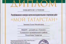 Педагог Заикина Е.М. стала победителем 1 степени Республиканского конкурса научно-исследовательских и творческих работ "Мой Татарстан" 19.01.2018