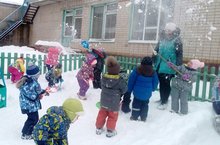 На прогулках дети совместно с воспитателями и младшими воспитателями приобщаются к труду на свежем воздухе, участвуют в уборке снега на территории.