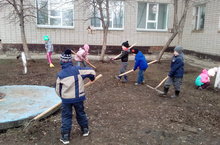Дети с удовольствием убирают грабельками прошлогоднюю листву, наводят порядок на своем участке.