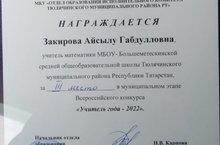 6 декабрь көнне Үзәк урта мәктәбе базасында "Ел укытучысы - 2022" Бөтенроссия конкурсының муниципаль этабы (финал) булып узды. Конкурс нәтиҗәләре буенча Олы Мәтәскә урта мәктәбенең математика укытучысы Закирова Айсылу Габдулла кызы 3 урынны яулады. Котлыйбыз! Алга аба да зур уңышларга ирешүен телибез!