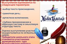 16 марта в МБОУ-Узякской СОШ прошел муниципальный этап Всероссийского конкурса чтецов «Живая классика». К участию в конкурсе приглашаются учащиеся 5-11 классов учреждений общего и дополнительного образования. В ходе конкурсных испытаний участники декламируют отрывки из своих любимых художественных произведений, любых российских или зарубежных авторов XVIII-XXI века, написанных прозой. От нашей МБОУ-Большенырсинской СОШ выступили ученицы Биктагирова Я., Фадеева А. и Каримуллина Л. Поздравляем участников конкурса, желаем творческих успехов!