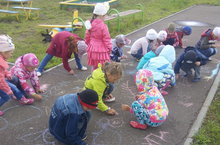 Рисунки на асфальте. / Асфальттагы рәсемнәр. 14.07.2015 Безнең балалар, буген асфальтта акбур белән чәчәкләр, күбәләкләр ясадылар, чәчәкләрнең яфракларын йөртергә өйрәнделәр. Һәрберсенең үз кояшы балкыды, кемдер бик тырышып салават күпере ясады, ә кайсыдыр баланың асма бикәсе җылы кояш нурларында җылынырга "чыккан" иде, кемдер кара болытлар һәм яңгыр тамчылыры ясарга да өлгерде.