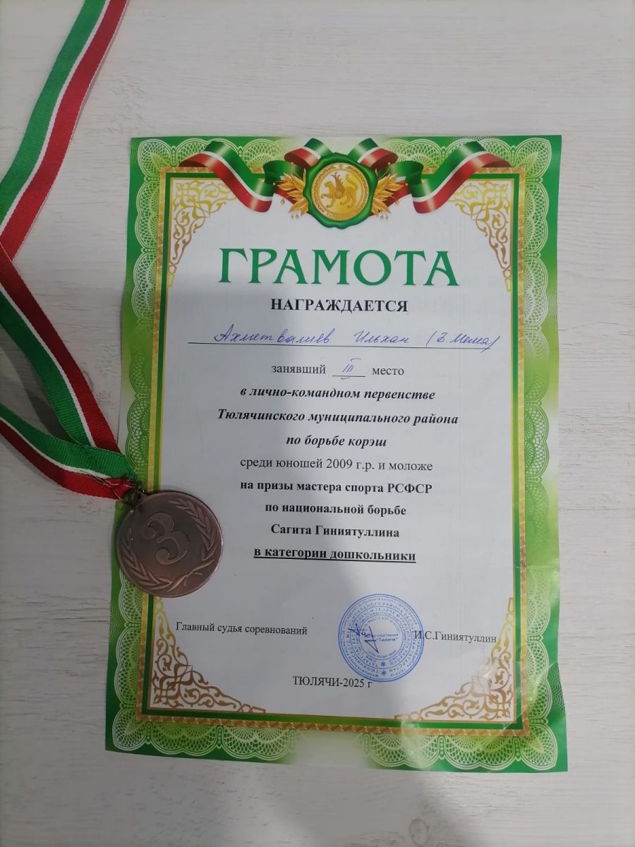 Опубликовано: 19.02.202519 февраля 2025 года в УСЗ «Батыр» с.Тюлячи «СШ «Тюлячи» провела лично-командное Первенство Тюлячинского муниципального района по корэш среди юношей 2009 г.р. и моложе на призы мастера спорта РСФСР, заслуженного фермера РТ Сагита Гиниятуллина. В этом соревновании воспитанник подготовительной группы нашего Тюлячинского детского сада № 3 Ахматвалиев Ильхан И. занял третье место в своей весовой категории. Поздравляем!!!