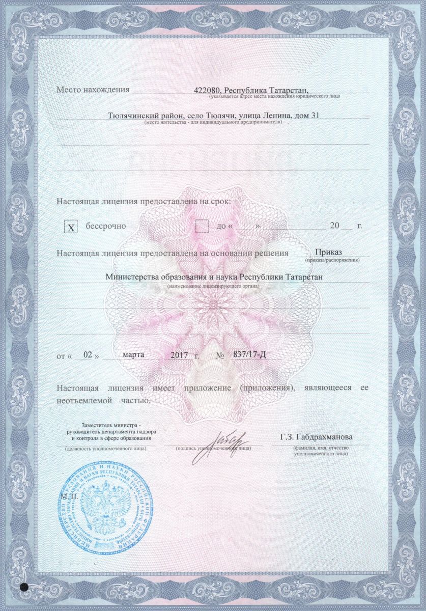 | Адрес: | 422080,РТ,Тюлячинский район,сТюлячи,ул.Фатыха Хусни, д.6А |