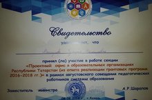 8 августта мәгариф хезмәткәрләренед август кидәшмсе рамкаларында Казанның 146 нчы номерлы мәктәп базасында “Татарстанныд мэгариф оешмаларында Проект офисы” дип исемләнгән секцион утырыш узды. Утырыш эшендэ Балалар иҗат үзәге директоры Мәхмүтова Зөлфия Шамил кызы катнашты. Секцион утырыш кысаларында 2016-2018 елларда белем бирү оешмалары-грант алучыларга 4 маршрут буенча чыгу оештырылды. Көннең икенче өлешендә пленар утырыш узды.