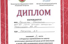 Плечистов Константин учащийся объединения «Авиамоделирование» (руководитель Нуртдинов Руслан Раисович) МБУДО «Центр детского творчества» Тюлячинского муниципального района РТ принял участие и занял 3 место в открытых соревнованиях по запуску метательных авиамоделей среди детей-инвалидов и детей с ОВЗ, посвященных декаде инвалидов, проведенных в пгт. Богатые Сабы 13 декабря 2017г..Теләче муниципаль районы “Балалар иҗат үзәге” өстәмә белем бирү муниципаль бюджет учреждениясеннән «Авиа моделирование» түгәрәгенә йорүче Плечистов Константин (җитәкчесе Нуртдинов Руслан Рәис улы) Саба мәктәп-интернатында инвалид балалар арасында, 13 декабрьдэ үткәрелгән республика күләм ачык авиамодельләр очыру ярышында катнашып, 3 урынга лаек булды. -