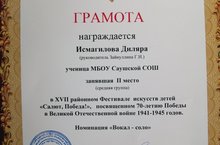25 апреля в районном доме культуры прошел XVII районный фестиваль искусств детей «Салют, Победа!», посвященный 70-летию Победы в Великой Отечественной войне 1941-1945 годов. В этом фестивале из нашей школы участвовала ученица 8 класса Исмагилова Диляра. В номинации «Вокал-соло» она заняла 2 место и была награждена грамотой.