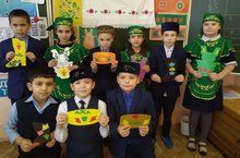 В фойе 1 этажа была организована выставка. На выставке были тюбетейки, калфаки, куклы в национальных костюмах, фартуки с национальной вышивкой, национальные блюда – чак-чак, треугольники, лепешки, блины.