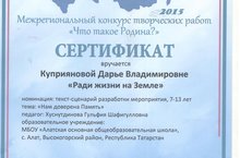 Куприянова Дарья, ученица 7 класса,награждена сертификатом за участие в Межригиональном конкурсе творческих работ "Что такое Родина?" в номинации: "Ради жизни на Земле". Молодец!