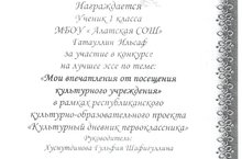 Ученик 1 класса Гатауллин И. награжден дипломом за лучшее эссе по теме: "Мои впечатления от посещения культурного учреждения" в рамках республиканского культурно - образовательного проекта "Культурный дневник первоклассника" Руководитель Хуснутдинова Г.Ш.Алатская средняя школа. -
