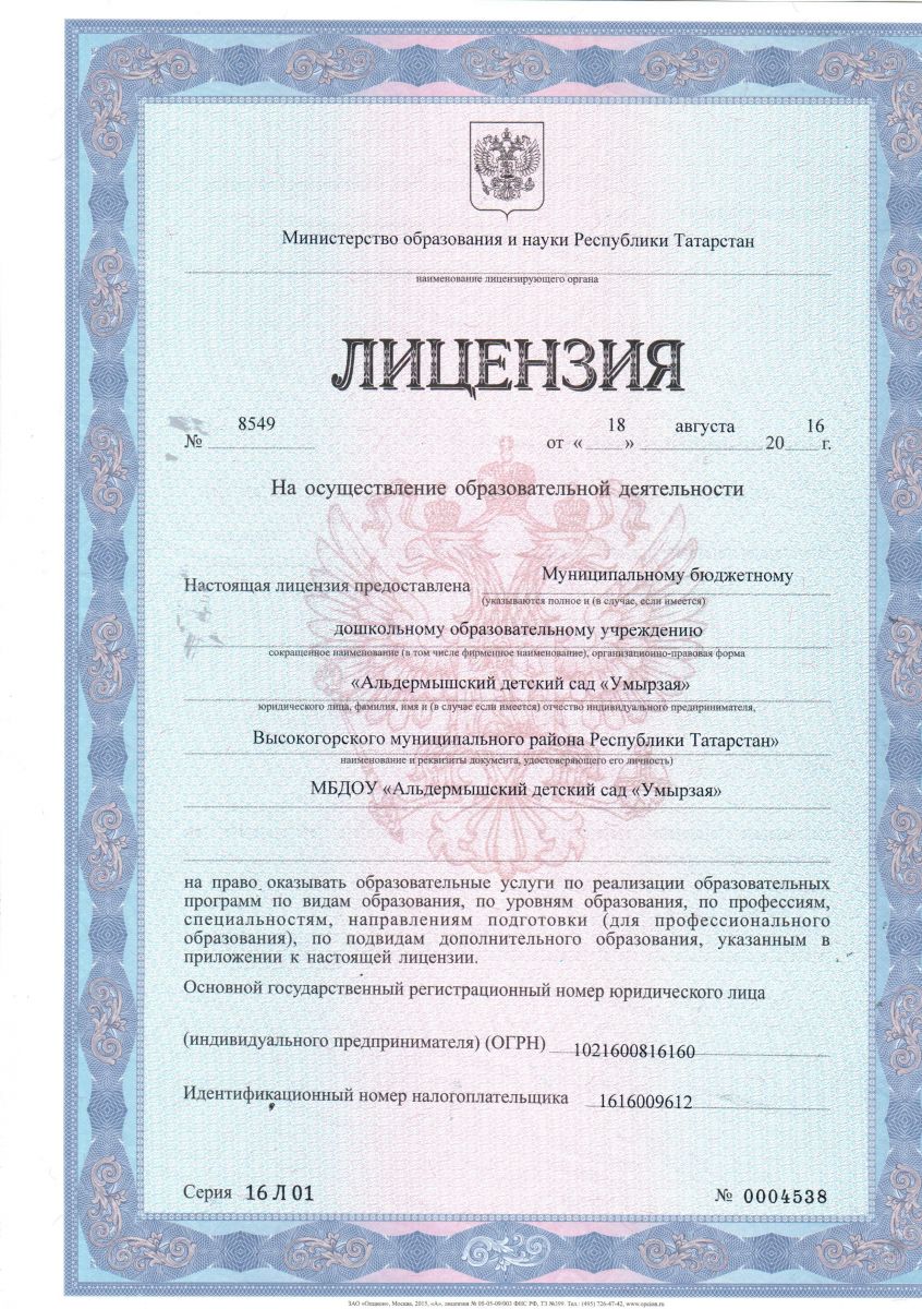 Учреждение осуществляет образовательную деятельность на основании лицензии от 18.08.2016г., регистрационный номер 8549, серия 16 Л 01 № 0004538, срок действия бессрочно на право ведения образовательной деятельности в соответствии с приложением. Лицензия |