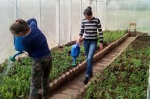 Учащиеся поливают рассады помидор. /Укучылар помидор үсентеләренә су сибәләр. 08.05.2019