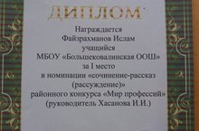 Ученик 9 класса нашей школы Файзрахманов Ислам занял 1 ое место в районном конкурсе "Мир профессий" в номинации "Сочинение -рассказ(рассуждение".