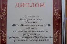 Ученица 9 класса нашей школы Насыбуллина Лиана заняла 2 ое место в районном конкурсе "Мир профессий" в номинации "Сочинение -рассказ(рассуждение".
