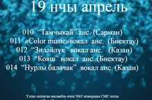 С этого дня четыре раза в неделю в 15.40 на главном телеканале республики можно увидеть выступление тех детей, которые прошли второй тур (на третьем этапе осуществлялись видео запись участников фестиваля).От Дома детского творчества участвуют 19 апреля- вокальные коллективы "Кояш"(013), "Color music"(011),17 апреля- солисты Ахунова Камиля (005) и 18 апреля-Миндубаева Дина(009). Просим поддержать наших вокалистов, отправив СМС с номером вокалиста на номер 5065. -