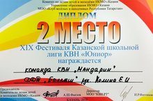 25 октября в концертном зале молодежного центра "Ак Барс" г. Казани прошёл 19-й фестиваль Казанской школьной лиги-юниор КВН. В фестивале участвовали 15 детских команд КВН из Казани, Альметьевска и Чистополя. Девочки из Студии танца "Мандарин" , под руководством Холиной Екатерины Игоревны создали команду КВН " Мандарин", и приняли участие в фестивале. По итогам мероприятия они заняли 2 место и попали в новый сезон игр Юниор лиги. Желаем им новых побед! Поздравляем !