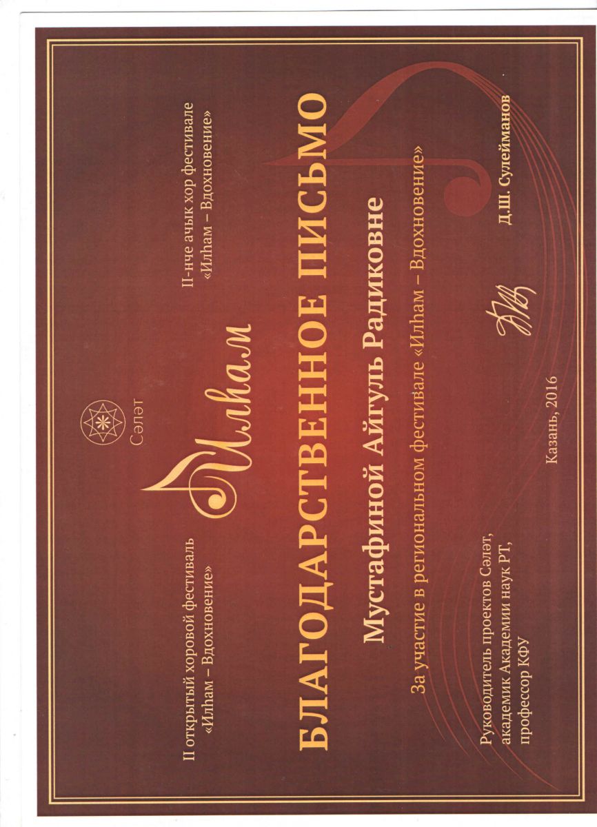Мустафина Айгуль Радиковна - Региональный фестиваль "Илхам-Вдохновение", благодарственное письмо