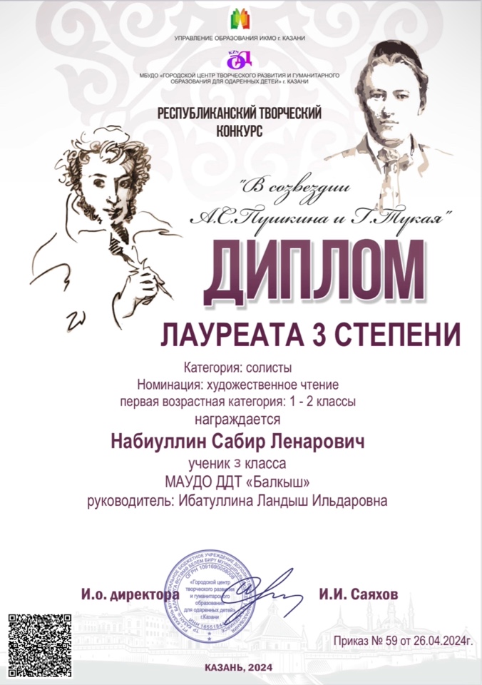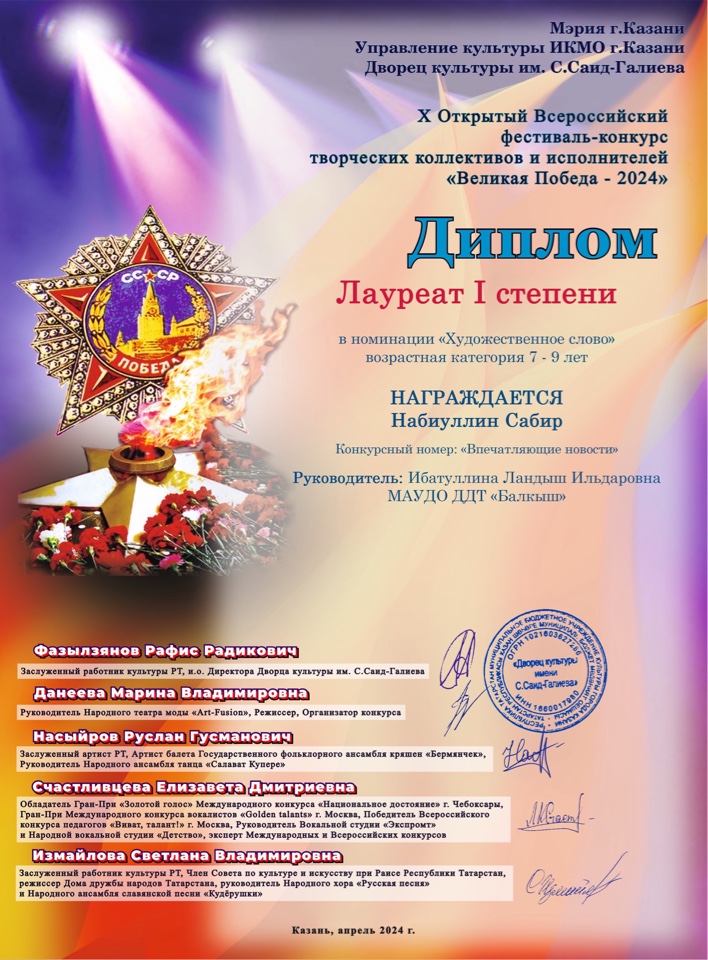 X Всероссийский фестиваль-конкурс "Великая Победа - 2024"- Набиуллин Сабир, лауреат 1 степени