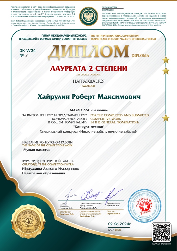 X Всероссийский фестиваль-конкурс "Великая Победа - 2024"- Хайрутдинова Рамиля, лауреат 1 степени