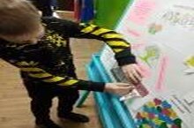 Учащиеся 1 класса изучают по обучающему плакату основы здорового психологического климата в коллективе.