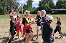 ребята - рисовали интересные и смешные рисунки на лицах, девочки заплетали косы, собирали хвосты. После вожатые и воспитанники сыграли в комический футбол. Вожатые играли в разных ролях - это и медсестра, и бабушка с клюшкой, и маленький ребёнок, и повар. Самое интересное, что вожатые в этих ролях играли не по правилам, двигали ворота, прятали мяч, обливали водой и т.д. Мероприятие прошло очень весело!!!
