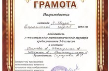 Победителями муниципального математического турнира среди обучающихся 5-6 классов стали учащиеся нашей школы, а именно: Шитова А., Ибатуллин А., Шастин А. и Рахматуллина Э. Руководитель команды: Сиразиева Ф.Г.
