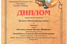 Ученица 10 класса Гордынгер Кристина под руководством учителя истории Глушковой Е.В. приняла участие в конкурсе с научно – исследовательской работой на тему «Быт русского крестьянства Казанской губернии во второй половине 19 века» и получили диплом участника.