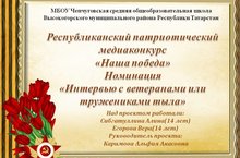 Участники ДОО " Наследники Отечества" в рамках подготовки к празднованию 71-й годовщины Победы в Великой Отечественной войне 1941-1945, приняли участие в медиа-проекте " Наша Победа". Номинация " Интервью с ветеранами или тружениками тыла". Ребята взяли интервью у Петуховой Валентины Алексеевны, которая рассказала им о всех тяготах военной и послевоенной жизни.