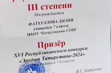 Фатхуллову Дилию-ученицу 7 класса- призера XVI Республиканского конкурса «Эрудит Татарстана-2024 г.» среди учащихся 7-8 классов.