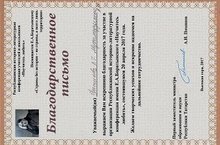 Благодарственное письмо воспитателю разновозрастной группы от 4 до 7 лет Мухаммадуллиной А.И за участие в Республиканской историко-литературной конференции имени Е.А.Боратынского "Научись любить", которая прошла на базе УСОШ. / Республика тарихи –әдәби конференциясе Е.А. Боратынский исемендә мәктәптә үткәрелде.Тәрбияче А.И. Мухаммадуллинага рәхмәт хаты тапшырылды.