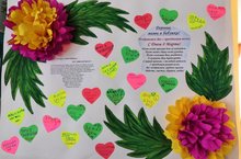 8 Марта -самый любимый праздник всех детей и мам. В этот прекрасный день ребятишки стараются удивить сюрпризами своих любимых мамочек. В день 8 Марта дети подготовительной группы решили порадовать не только подарками, но и сделать стенгазету , где они на разноцветных сердечках написали слова любви , уважения к мамам. Мамы были в восторге и приятно удивлены.