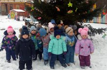 Сегодня на территории детского сада поставили елку. Украсили ее разными игрушками. Малыши с радостью водили возле елки хороводы.