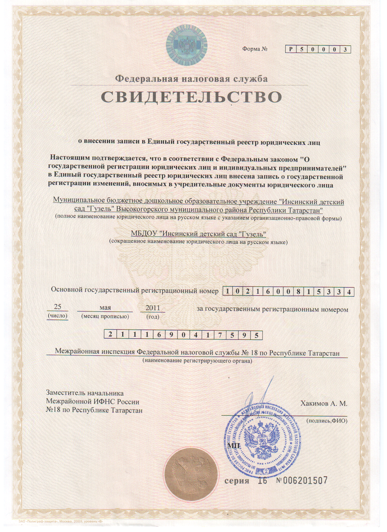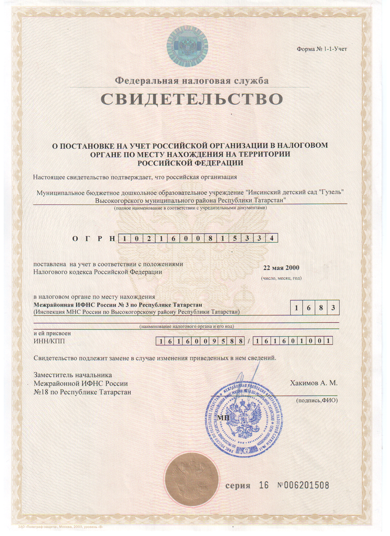 Свидетельство о постановке на учет в налоговом органе