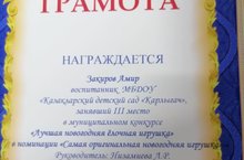 Участвовали в районном конкурсе "Лучшая новогодняя игрушка".Амир Закиров занял второе место.