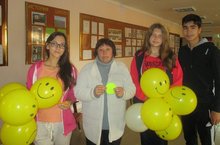Всем ученикам и сотрудникам школы были подарены бумажные смайлики, малышам достались смайлики-шары.