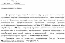 Департамент государственной политики в сфере среднего профессионального образования и профессионального обучения Минпросвещения России информирует о том, что ФГБОУ ДПО "Институт развития профессионального образования" совместно с АНО "АртМастерс" ("Мстера искусств") проводят исследования востребованных работадателями и обучающимися образовательных программ, направленных на приобретение компетенций, навыков и квалификаций в сфере креативных (творческих) индустрий в период с 16 по 22 ноября 2021 года.