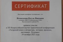 Исмагилова Язгуль, ученица 9 класса под руководством учителя татарского языка и литературы приняла участие во Всероссийской практической конференции "Татарский язык и литература, история, прошлое, настоящее, будущее".