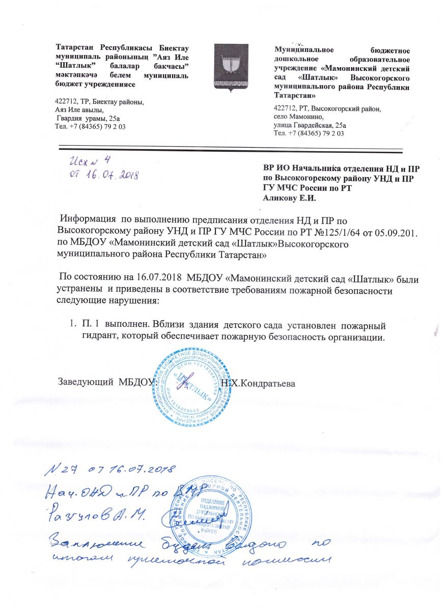 Муниципальное бюджетное дошкольное образовательное учреждение «Мамонинский детский сад «Шатлык» Высокогорского муниципального района РТ