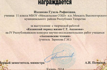 "Аксаков укулары"нда безнең 11 нче сыйныф укучыбыз Ихсанова Гүзәл дипломга лаек булды. Котлыйбыз.