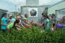 Авылыбыз һәйкәленә сәяхәт иттек, аның алдына утыртылган чәчәкләрне карадык, чүпләрне утадык. Хәрби-патриотик җырларны искә төшердек һәм җырладык. Сугыш темасына багышланган шигырьләр конкурсын үткәрдек.