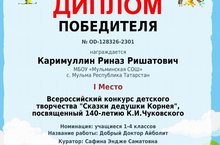 Ученик первого класса Каримуллин Риназ занял первое место во всероссийском конкурсе творчества „Сказки Дедушки Корнея". Поздравляем!! Руководитель Сафина Э.С.