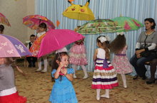 Осенний праздник прошел во всех группах детского сада "Калинка". В гости к ребятам с играми, загадками и вкусными подарками заходили Осень Золотая и Пугало Огородное. Ребята подготовили для гостей стихи, песни, танцы с осенними листиками и с зонтками.