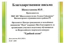 Преподаватель Шамсутдинова Ю.Р. награждена Благодарственным письмом за подготовку учеников к конкурсу. -