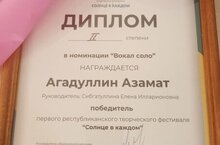 6 ноября в ДК "Сэйдэш" состоялся благотворительный фестиваль "Солнце в каждом" и в номинации "Вокал-соло" Агадуллин Азамат (руководитель Сибгатуллина Е.И.) стал победителем 2 степени! Поздравляем Азамата, желаем дальнейших успехов и побед!!