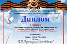 Поздравляем Хусаенову Ралину (преп. Галиуллина Г. И.) с Дипломом I степени Республиканского конкурса, посвященного 78 - й годовщине Победы в ВОВ "9 мая - День Великой Победы".